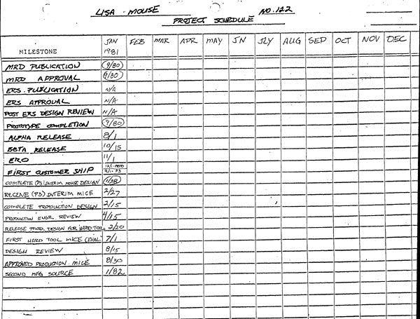Unknown, Lisa mouse project schedule. Handwritten copy of Lisa mouse project schedule, attached to the "Mouse Project Team Report December 1980 and January 1981."