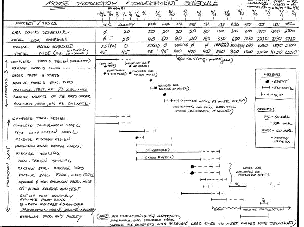 Unknown, Mouse production and development schedule. Handwritten copy of mouse production and development schedule, attached to the "Mouse Project Team Report December 1980 and January 1981." It shows various tasks, dependencies, and deadlines.