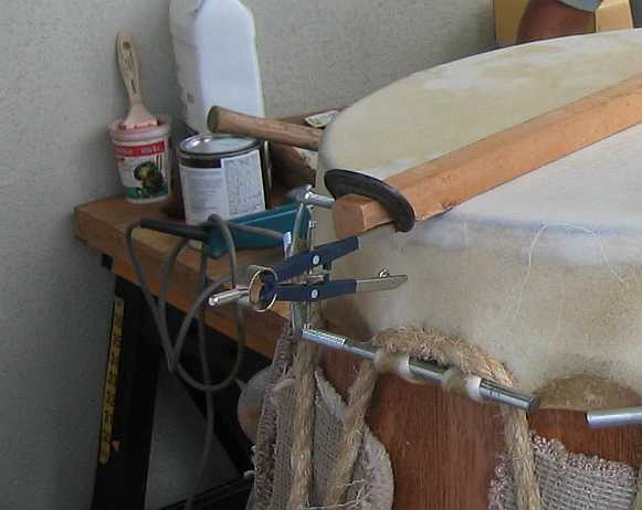• Flip the drum over to stretch and tack the second head.